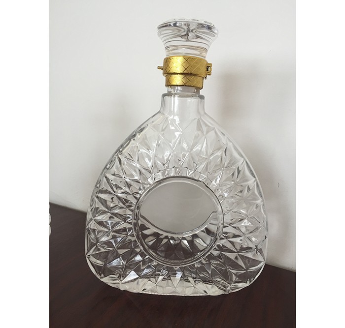 蒙砂酒瓶是在制品玻璃上,粘附一定大小面積的玻璃色釉粉,玻璃瓶廠經過580~600℃的高溫烘烤,使玻璃色釉涂層凝結在玻璃外表,并顯現出具有與玻璃主體不同顏色的一種裝飾辦法。粘附玻璃色釉粉,可用排筆涂刷,亦可用膠輥滾涂。經過絲印加工,能夠得到蒙砂面的樓空圖案。 其辦法是:在玻璃制品外表上,絲印一層由阻熔劑構成的圖案紋樣。